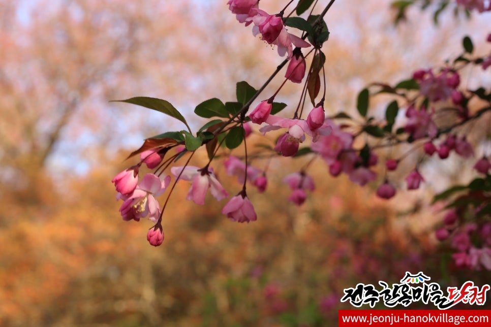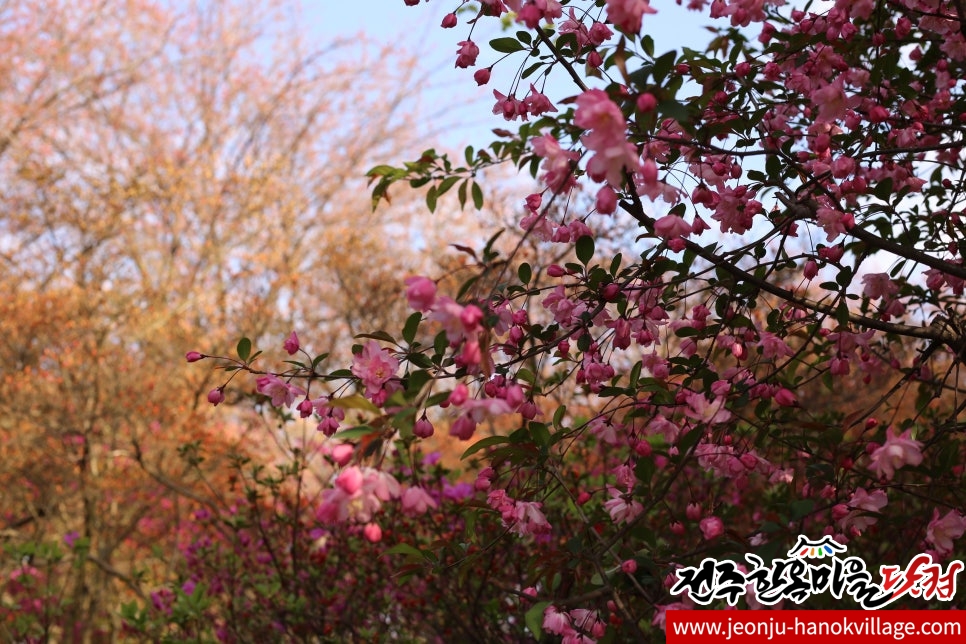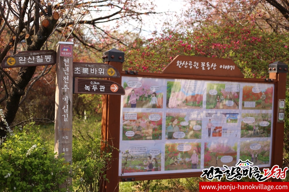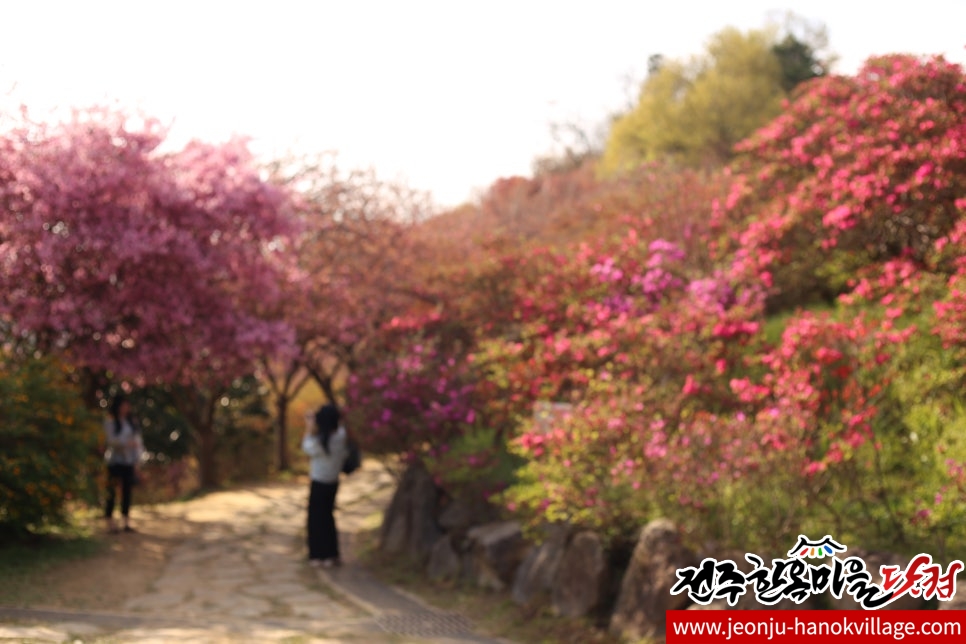 전주한옥마을과 남부시장에서 가까운 완산공원의 완산꽃동산에는 매년 4월 겹벚꽃과 대왕 철쭉꽃, 황매화꽃이 만개합니다.