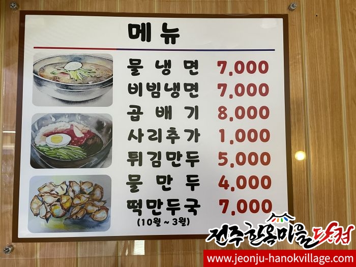 비빔냉면 7,000원 냉면곱배기 8,000원 사리추가 1,000원 ...