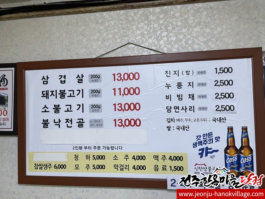 삼겹살 13,000원 비빔채 2,500원 주류 4,000원 ...
