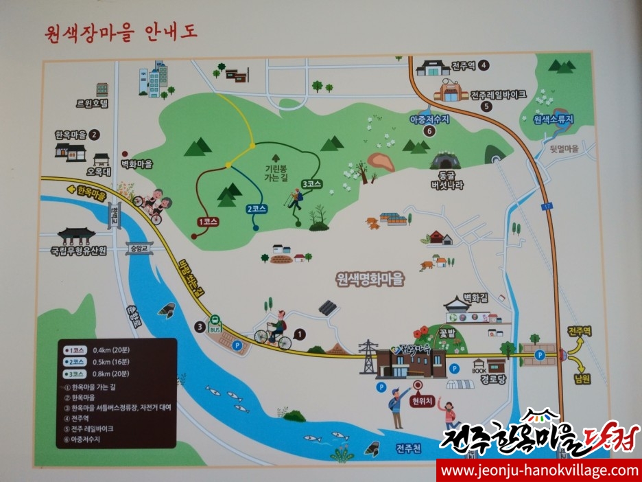 전주한벽문화관 - 한벽당 - 전주자연생태박물관 - 치명자산성지 - 미량박씨재실 - 원색명화마을 원색마루 - 원색경로당 (작은 도서관) 좌회전