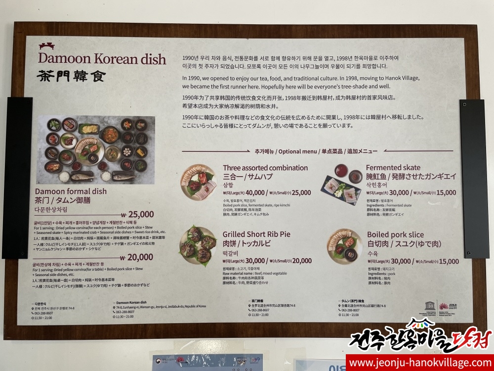다문(茶門)한식은 1998년 고사동에서 차와 술을 팔던 문화공간 다문이 전주한옥마을로 이사하면서 자리잡게 되었습니다.