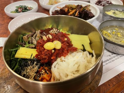 전통 전주비빔밥 전문점으로 추천하는 백년가게 '한국집'입니다.넓은 주차장과 전통한옥을 개조한 식당으로 고즈넉합니다.한옥의 서까래를 바라보는 고즈넉함과비빔밥 놋쇠 용기와 숟가락이 부딪쳐 풍경소리처럼 조그맣게 울리는 곳!육회비빔밥은 따뜻한 놋쇠그릇에 전주비빔밥 베이스에 육회를 넣었네요.노란 황포묵..